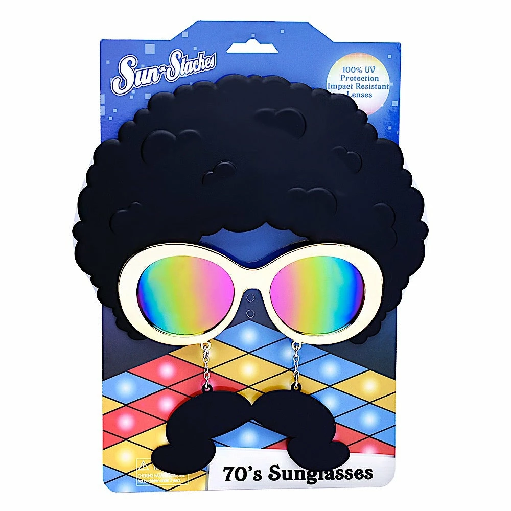 Bring disco back in these far out 70s Sunglasses. Feel the funk in these stylish spectacles, complete with a funky afro and matching mustache. Complete your 70s costume and look extra groovy on the dance floor. Whether you are at the disco club, a 70s party or just cruising in the Caddy, you’re gonna look great this pair of Sun-Staches. 🕺🏽