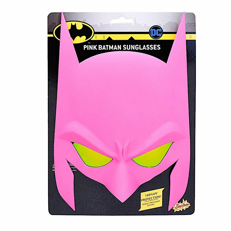 Save Gotham style with a pair of these Pink Batman Sun-Staches. Keep your identity a secret while looking great at the same time. Featuring his iconic bat mask in a bright pink finish and complete with yellow lenses, this pair of entertaining eyewear is fun for all occasions. Whether you’re beating up bad guys or cruising in the Bat Mobile, these stylish shades were made for fun in the sun. These aren’t just sunglasses, they’re Sun-Staches!