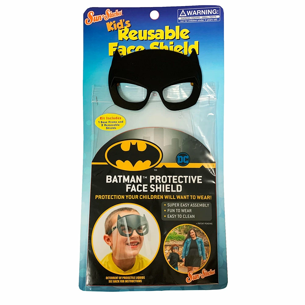 Glide into action and protect the city of Gotham in safety with our Lil’ Characters Batman Kids Reusable Face Shield. Keep your identity a secret with the iconic bat mask. Perfect for bats-in-training who need to save the city before bedtime these super shades are the best in entertaining eyewear. Featuring Batman’s iconic mask as well as TWO reusable face shields these are the perfect way to be safe and stylish. With an easily washable face shield and fashionable fun design, keeping your little hero safe has never been more fun. Our Lil’ Character face shields don’t come with lenses in the glasses so they won’t fog up or be too dark indoors. Comfortable to wear for long periods of time and easy to clean. These aren’t just sunglasses, they’re Sun-Staches!