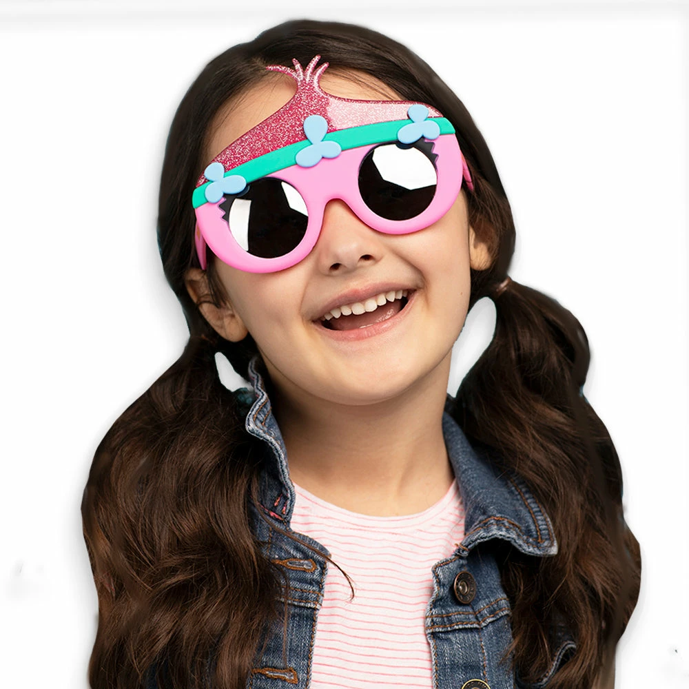 Stay true to yourself and dance to your own tune with a pair of Lil’ Characters Poppy Trolls Sunglasses. This pretty princess loves nothing more than singing and spreading joy with her fellow trolls. Featuring her tall pink hair and a green flower tiara crown, these stylish glasses are perfect for kids Poppy costumes and Trolls party supplies. Great for young Trolls and made for fun in the sun. These aren’t just sunglasses, they’re Sun-Staches! 🌼
