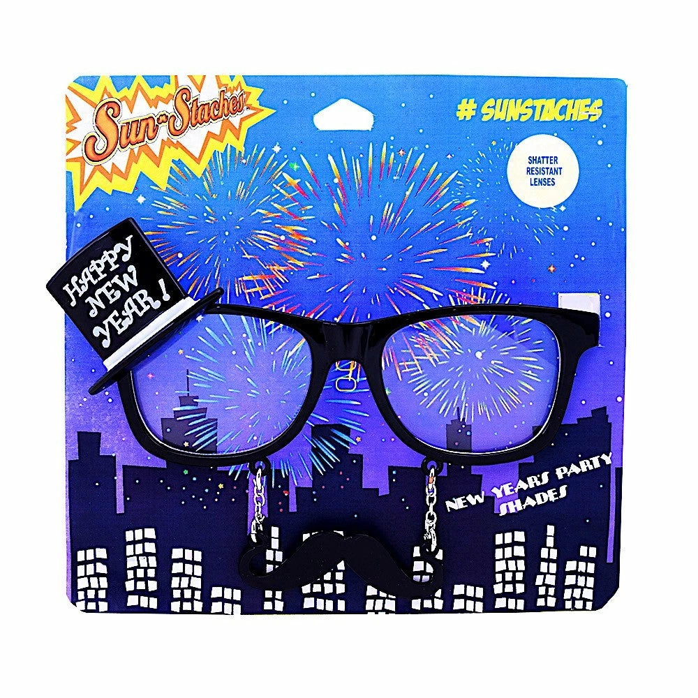 Celebrate a new year of surprise and opportunities in a pair of our Happy New Year Glasses. Start the countdown in style and and party like it’s 1999 in these stylish shades. Our New Years Glasses feature a “Happy New Year” hat, fancy black ‘stache and clear lenses perfect for New Years Eve and New Years Day. These New Years Glasses are essential New Years Eve party supplies and a great accessory for you New Years outfit 🎉