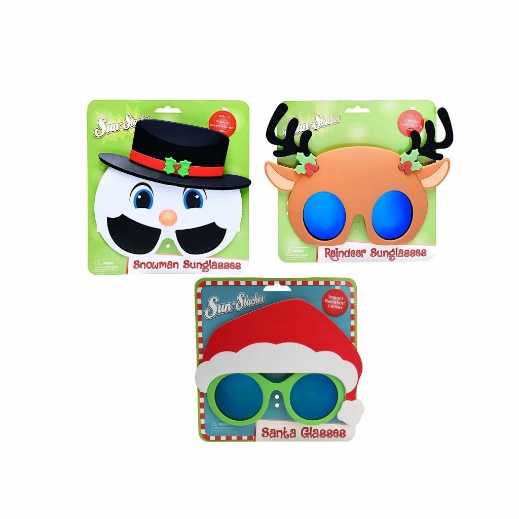 Get ready for the holidays with the Sun-Staches Holiday Fun Pack. Featuring the Snowman, Reindeer, and Santa Shades this gift of entertaining eyewear is sure to bring the holiday cheer. These Snowman Sunglasses are the coolest shades you’ll find this holiday season. Complete with UV400 protective lenses, these holiday-themed shades are fashionable, functional and perfect for Christmas gifts or Christmas party supplies. Impact resistant lenses offer additional protection in case of snowball fights. ⛄