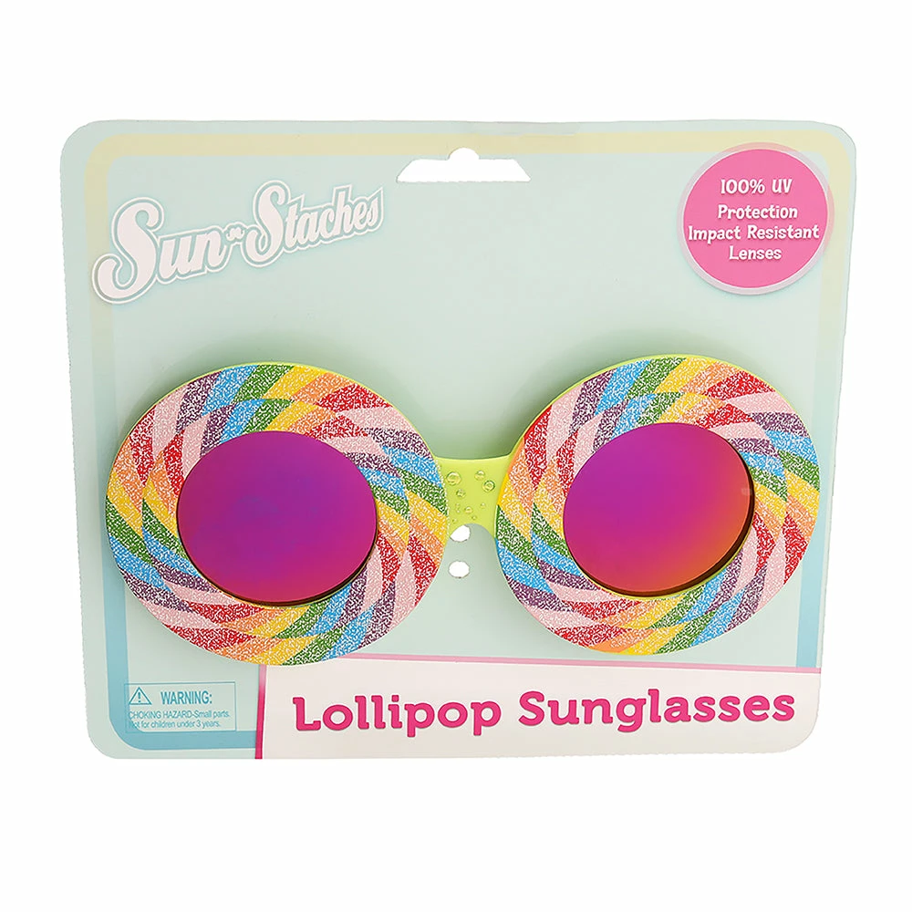 Treat yourself with a Lollipop Sun-Staches and be the sweetest thing around. Featuring rainbow lollipop frames and glitter these are perfect accessory to add a touch of sweetness to your outfit. UV protective lenses keep your eyes safe so you can have fun in the sun. Great for all ages and occasions. These aren’t just sunglasses, they’re Sun-Staches!