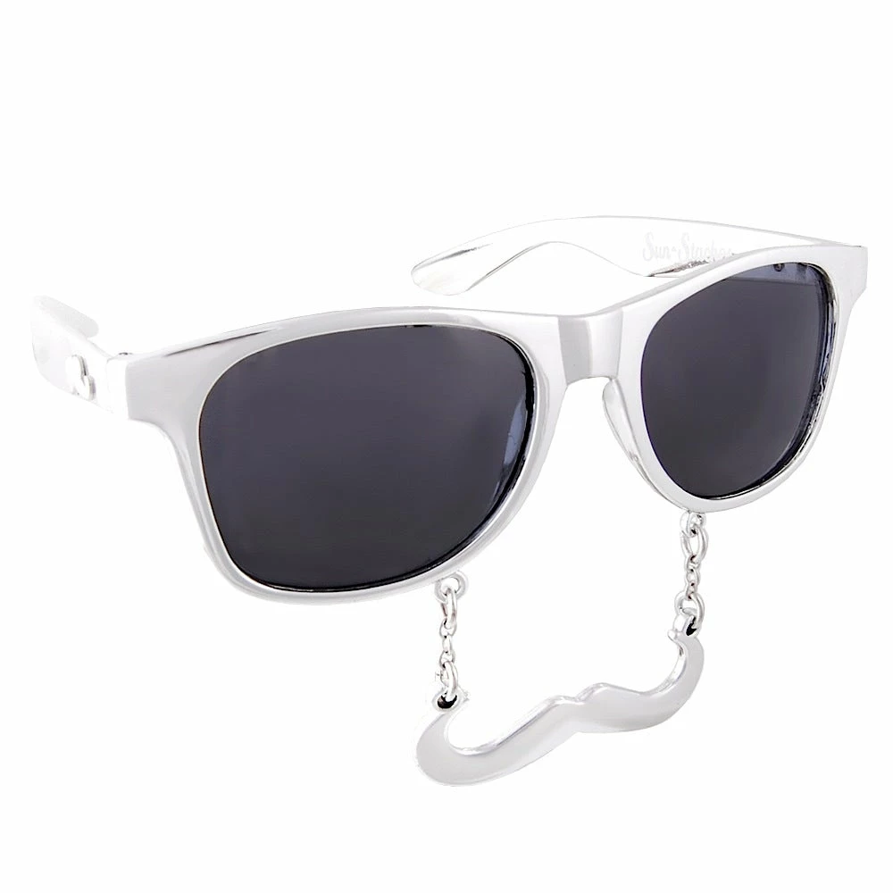 Brighten up your outfit with a pair of Metallic Silver Handlebar Sun-Staches. Featuring a metallic silver colored frame and classic handlebar mustache, this stylish classic has been brought back for a limited time. Complete with UV400 protective lens, these were made for fun in the sun. These are the perfect eyewear accessory for everything from costume parties to everyday entertaining eyewear. Great for all ages and made for fun in the sun. These aren’t just sunglasses, they’re Sun-Staches!