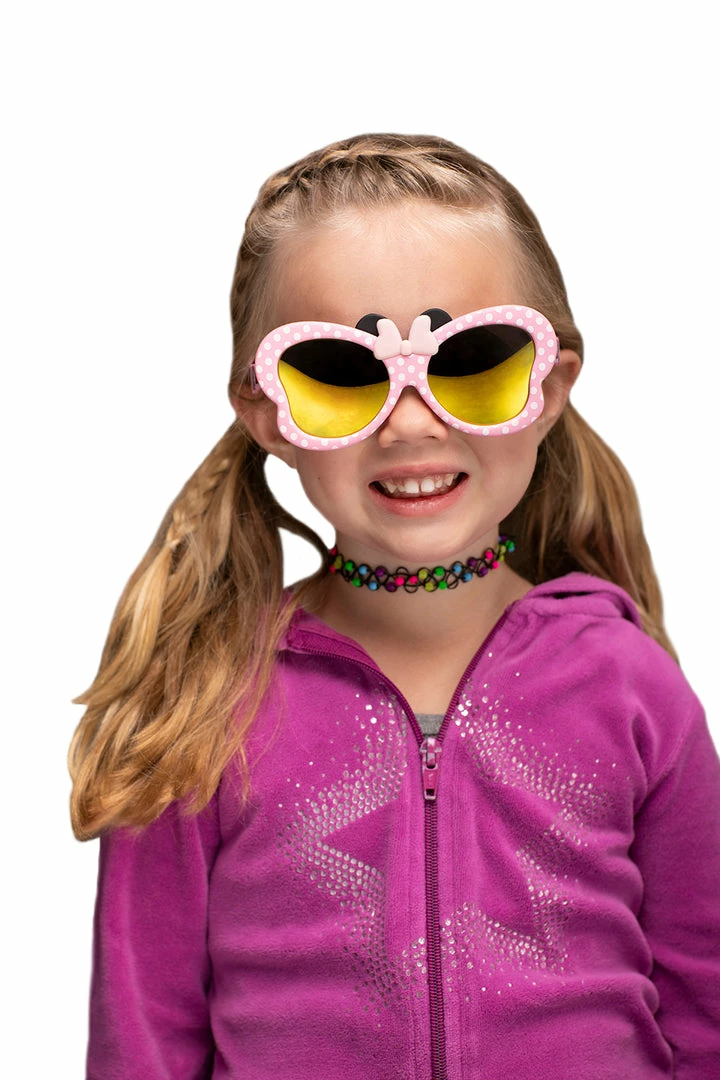 Be the cutest mouse in the house with a pair of Lil’ Characters Minnie Mouse Pink and White Polka Dot Sun-Staches. These fashionable shades feature a pink and white polka dot frame and Minnie’s adorable pink bow. Complete with UV400 protection and made for fun in the sun, these stylish shades are the perfect accessory for Disney fans of all ages. These aren’t just sunglasses, they’re Sun-Staches!