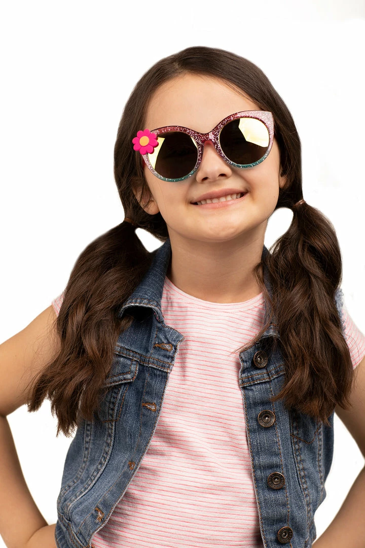 Get out and smell the flowers in a pair of Glitter Flower Sunglasses by Arkaid. These stunning shades feature a sparkly purple and blue frame with a cute flower added for style. UV protective lenses keep your eyes safe and are made for fun in the sun. These fun frames are perfect for your little one and are great for all occasions from birthday parties to everyday entertaining eyewear. These aren’t just sunglasses, they’re Sun-Staches!